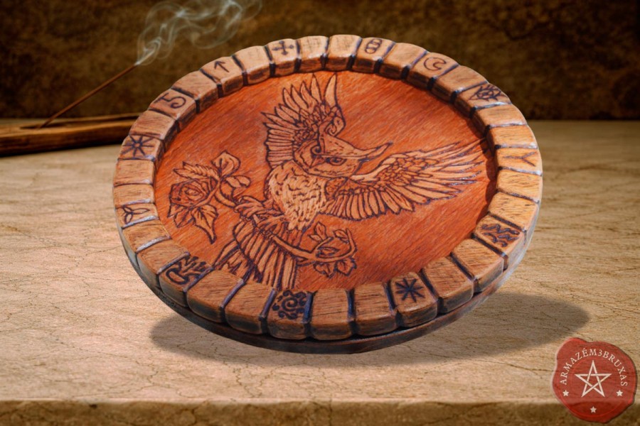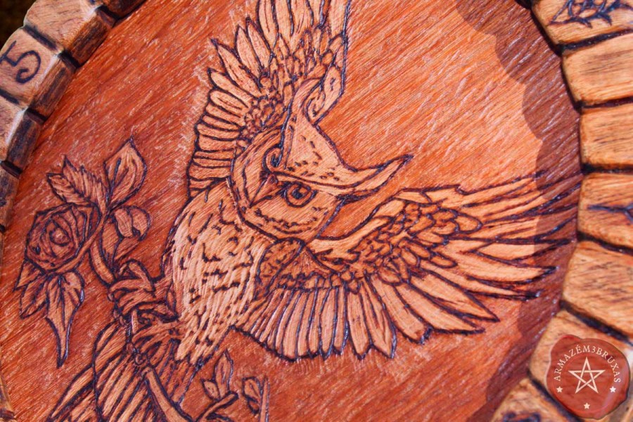 Esta tábua circular em madeira maciça, traz entalhes pirografados das 13 Runas das Bruxas, dispostas em sua borda revelando um verdadeiro círculo de poder. No centro da tábua, o arquétipo Coruja (símbolo do saber oculto e da visão no indizível) é impresso por entalhe e pirografia (queima controlada).