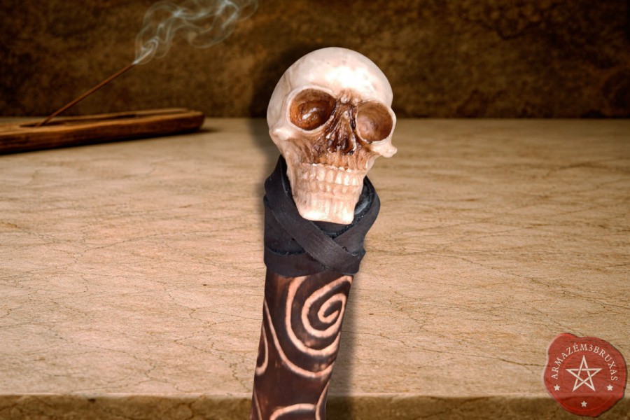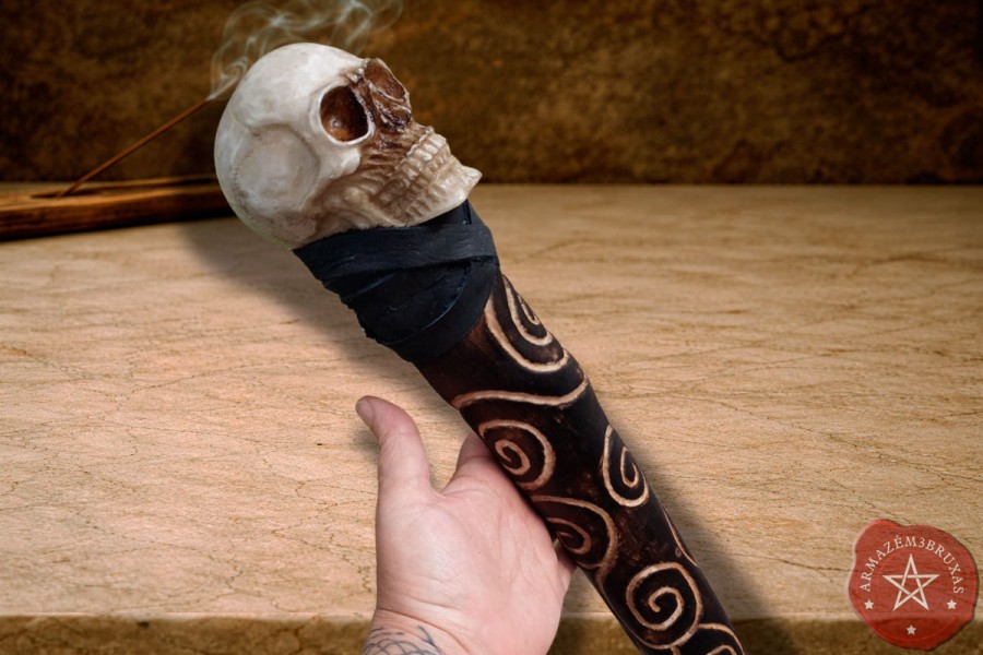 Cajado forjado artesanalmente em galho natural carbonizado, com curvatura original preservada, haste com entalhes em espiral de baixo relevo, representando a ascensão energética da força vital. Seu punho é formado por um crânio em resina, assentado de forma permanente e segura na madeira, envolto em couro bovino.