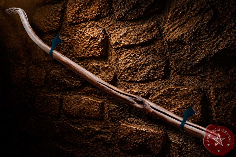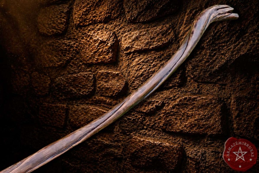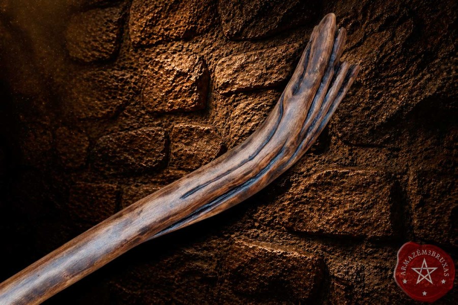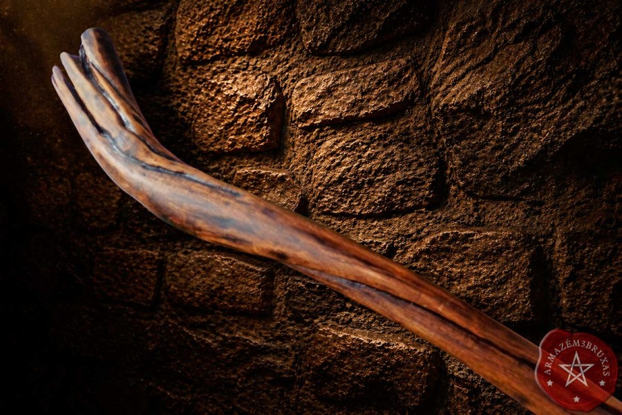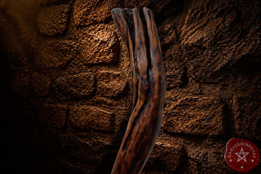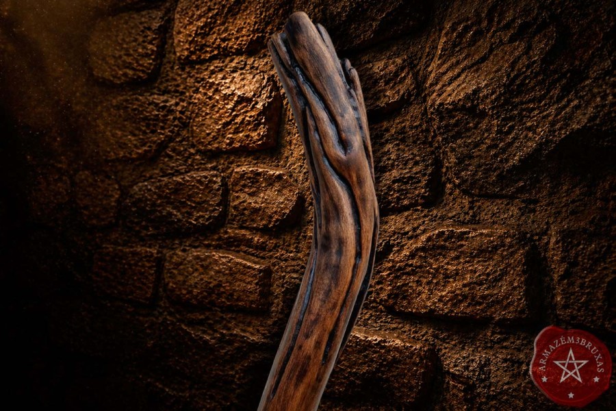 Punho e haste são entalhados, evidenciando as marcas do tempo e da jornada vivida na Terra, preservando a memória de sua força natural e seu propósito ancestral.