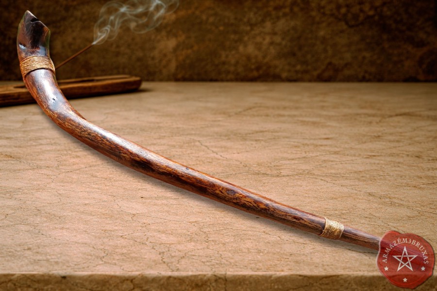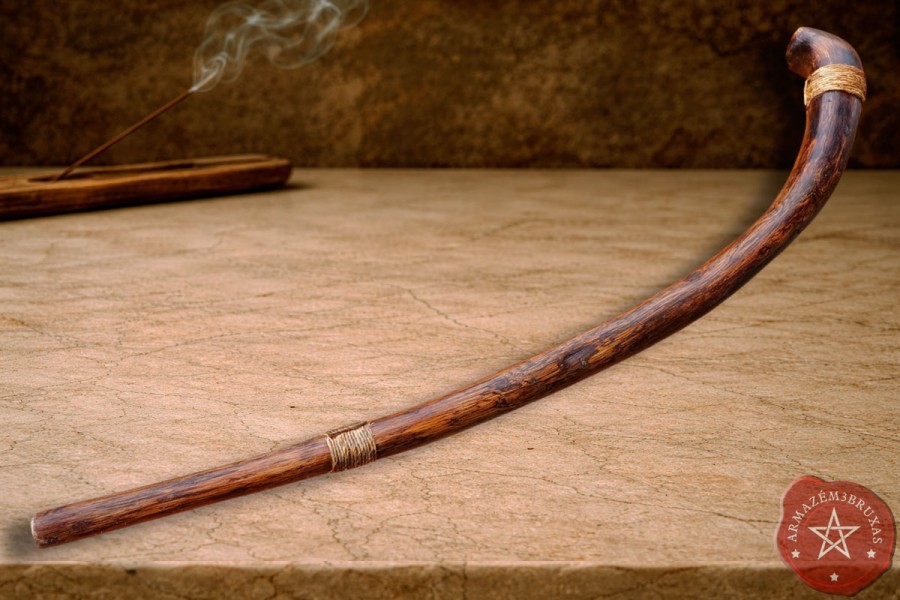 O punho e a haste são adornados com corda de sisal, elemento natural que reforça o elo entre o instrumento e as forças primordiais, trazendo firmeza, ancoramento e conexão com o plano material.