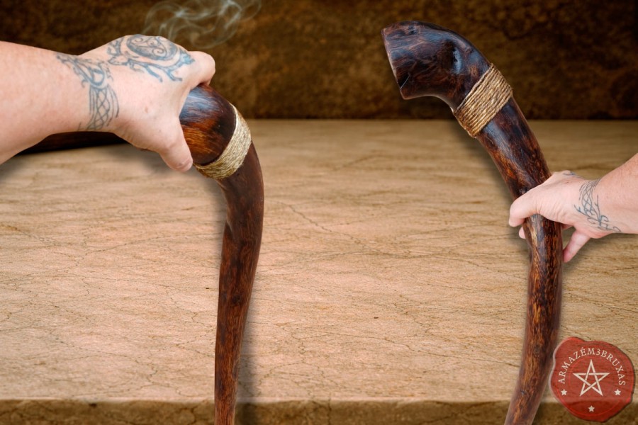 Cajado exclusivo, moldado pela própria Mãe Natureza e consagrado pelas forças cósmicas, a partir de uma raiz de Figueira submetida à carbonização - onde o fogo revela, purifica e eterniza.
