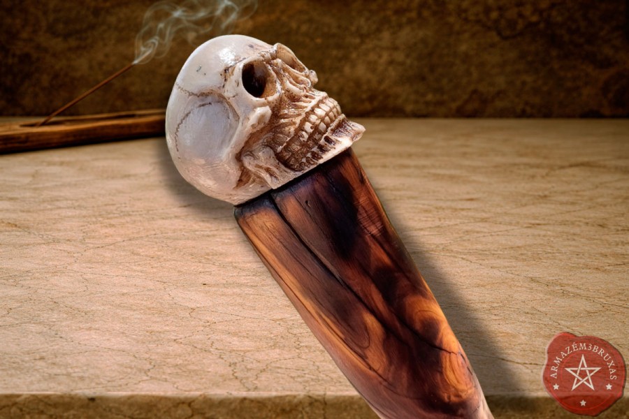 Cajado forjado a partir de galho natural, com curvatura original preservada, tonalidade da madeira parcialmente escurecida por carbonização e punho formado por um crânio em resina, assentado de forma permanente e segura na haste, envolto em couro bovino.