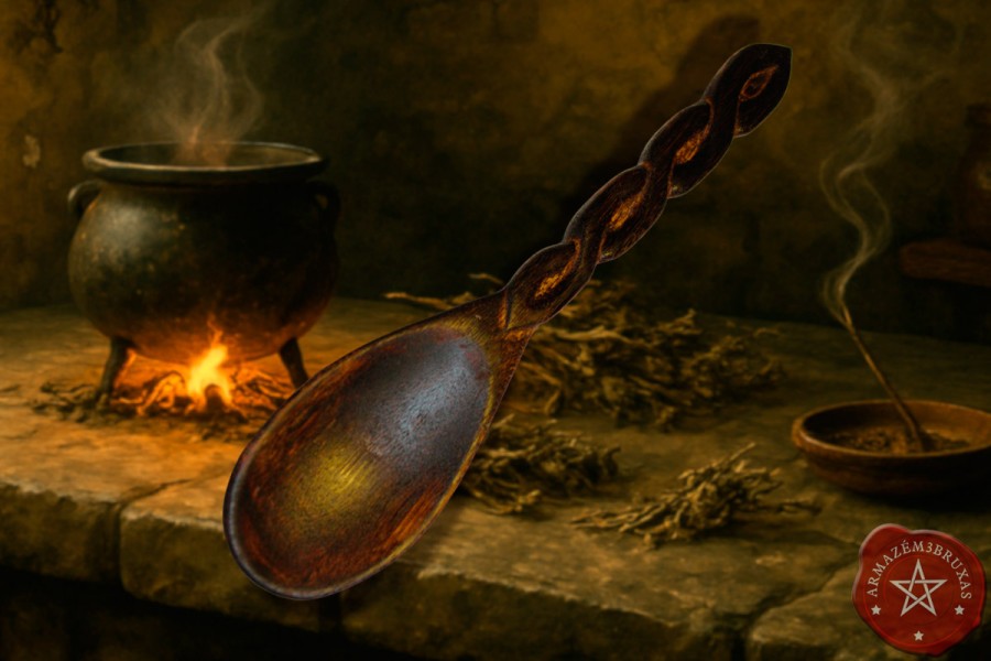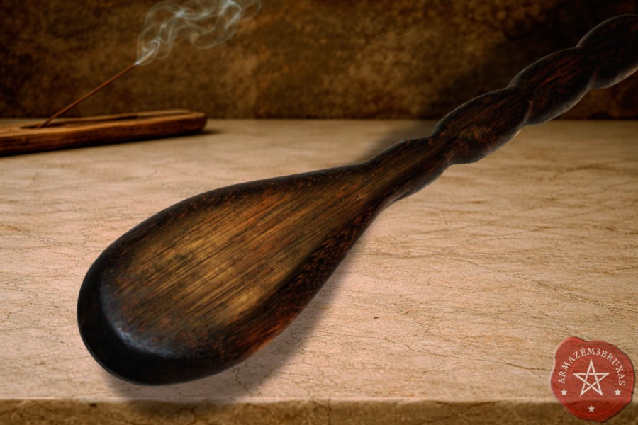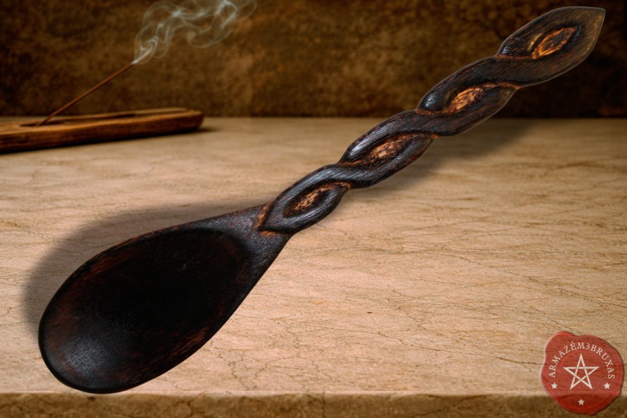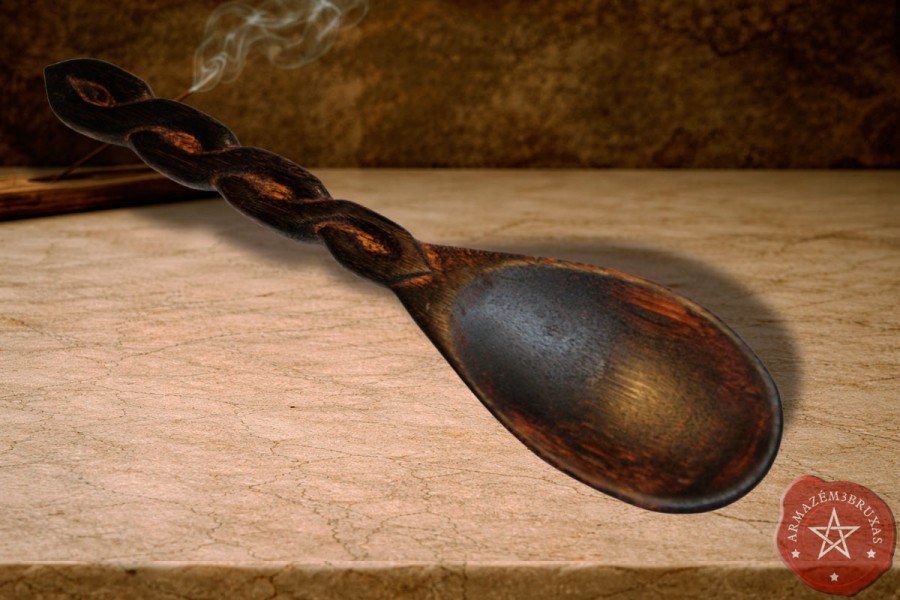 Colher forjada artesanalmente a partir de galho natural carbonizado, com punho entalhado. Produto 100% natural, finalizada com óleo de coco, tornando-a apta à utilização na culinária, em rituais e encantamentos alquímicos.