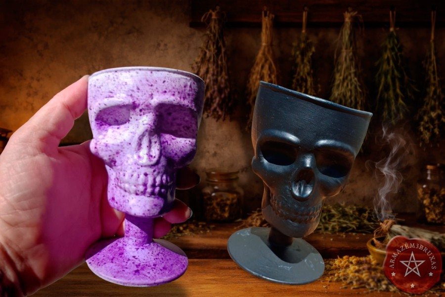 Dupla de Cálices em vidro moldado no formato de crânio ancestral, símbolo da sabedoria arcana e da transmutação.