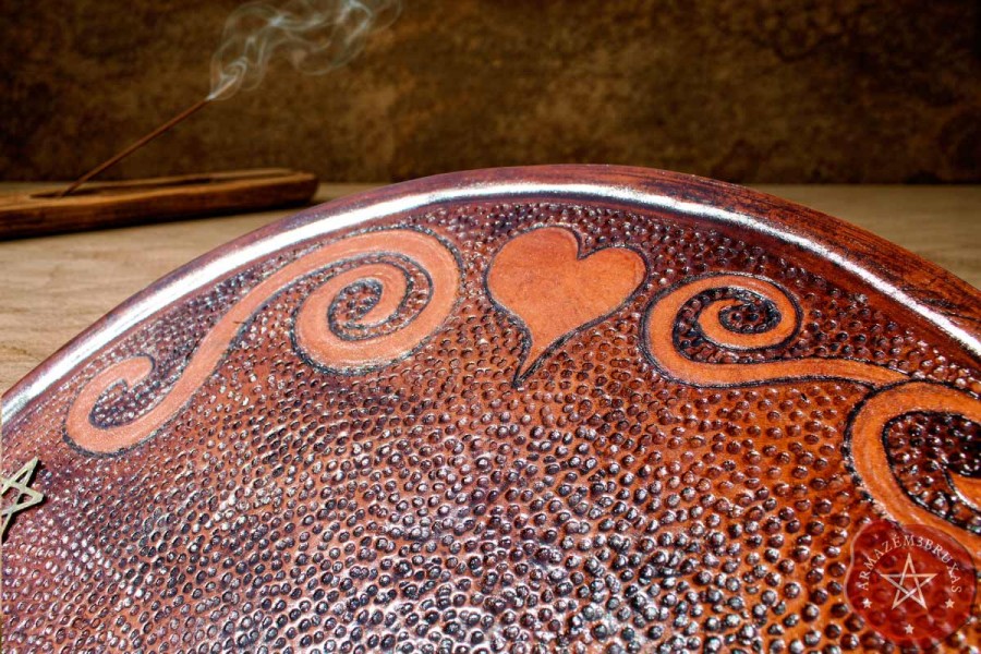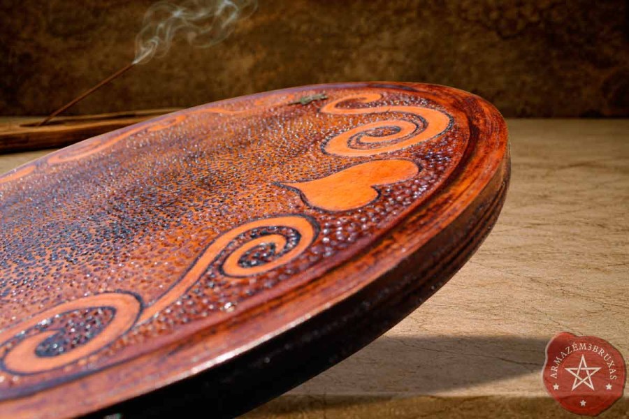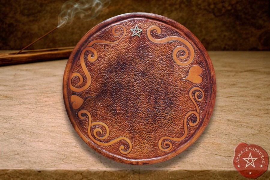 Forjada em madeira maciça e revestida na face superior com couro bovino, esta tábua rúnica é um instrumento de poder ancestral. Suas simbologias em relevo (sistrel e coração), são os ecos dos tempos antigos, e o pentagrama em liga metálica no topo fazem dela mais que uma ferramenta: um altar vivo de sabedoria oracular - não apenas acolhe as runas… ela às desperta.