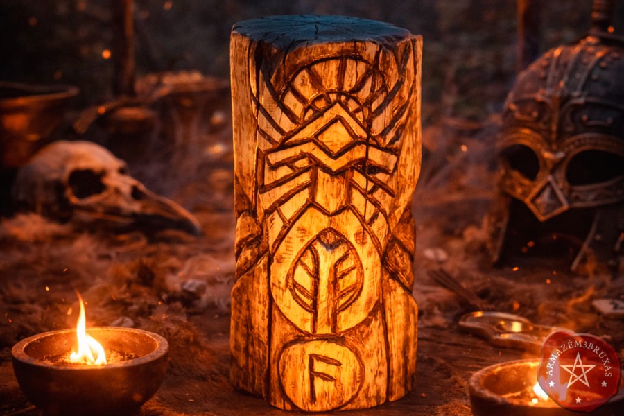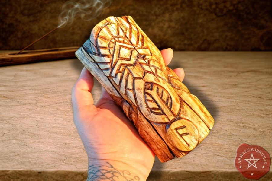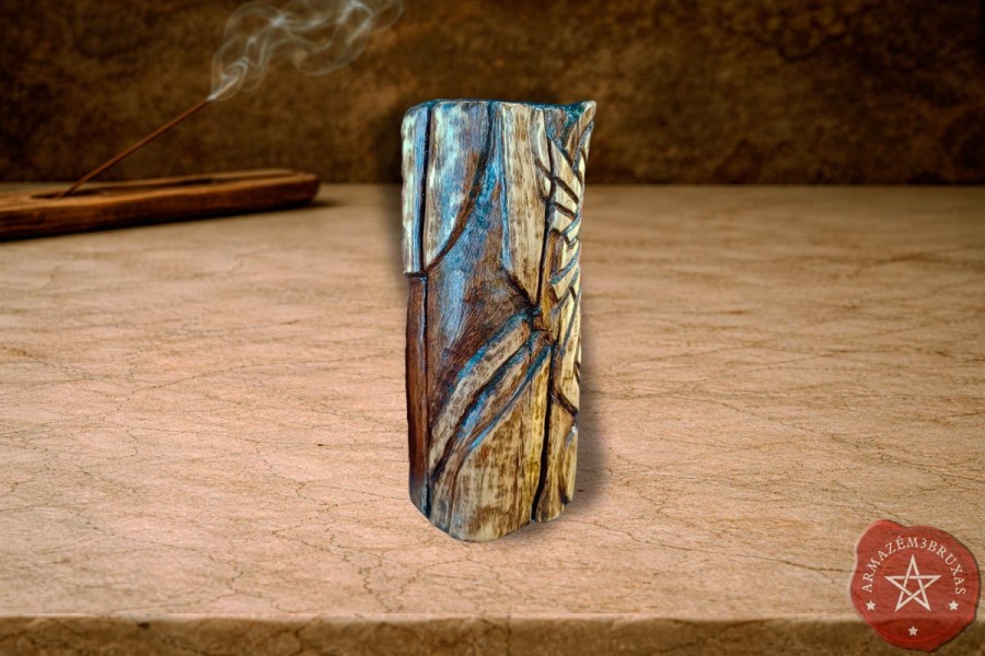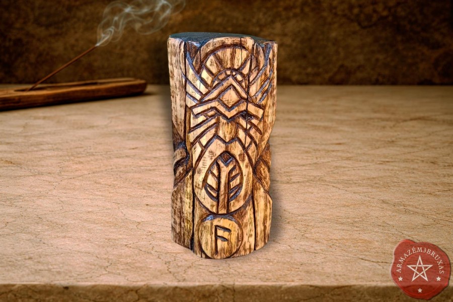 Escultura talhada frente e verso em uma raiz natural de Figueira, mantendo sua curvatura, textura e personalidade original. O entalhe revela Odin em relevo, guardião dos segredos rúnicos, acompanhado da runa Ansuz, símbolo de inspiração, mensagem divina e voz que atravessa mundos.