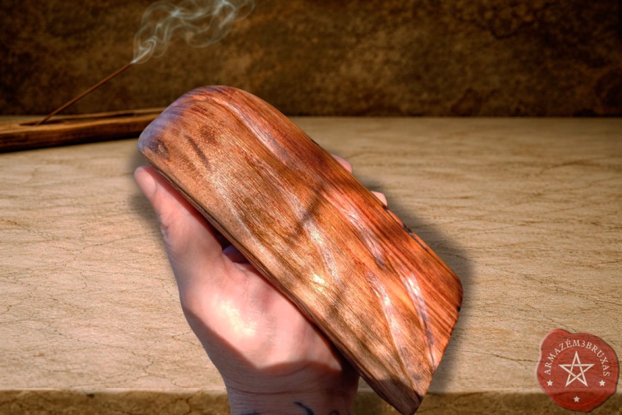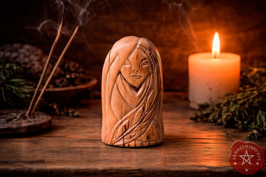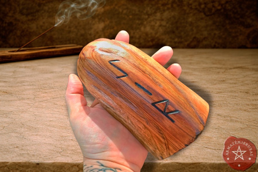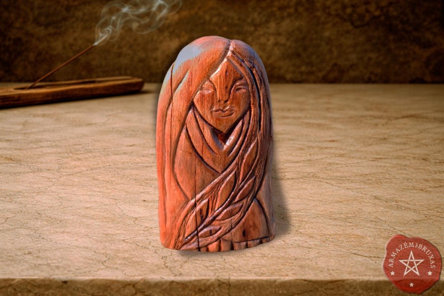 A tonalidade da madeira é mantida em sua forma natural e no verso da escultura, seu nome é entalhado em caracteres do alfabeto Futhark, consagrando a peça como um instrumento sagrado de conexão e devoção.