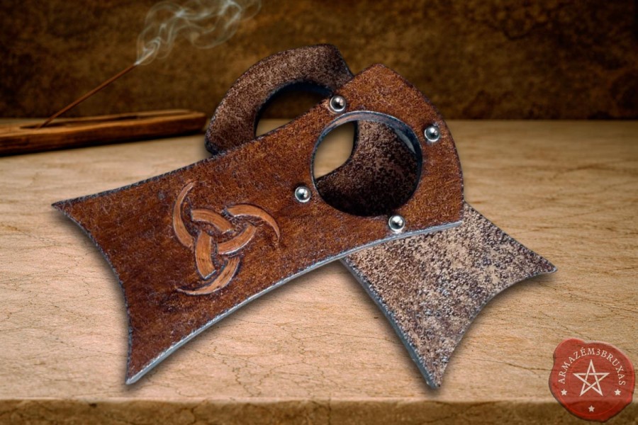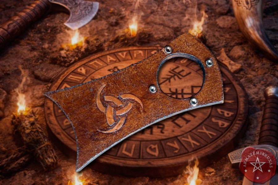 A área frontal o couro é texturizado, emoldurado por tachas metálicas que ressoam o vigor da forja ancestral. No centro, a simbologia nórdica Triple Horn de Odin modelada em relevo, trás a tríade da sabedoria – Óðrörir, Boðn e Són – como guardiões do ciclo do saber, do sacrifício e da inspiração.