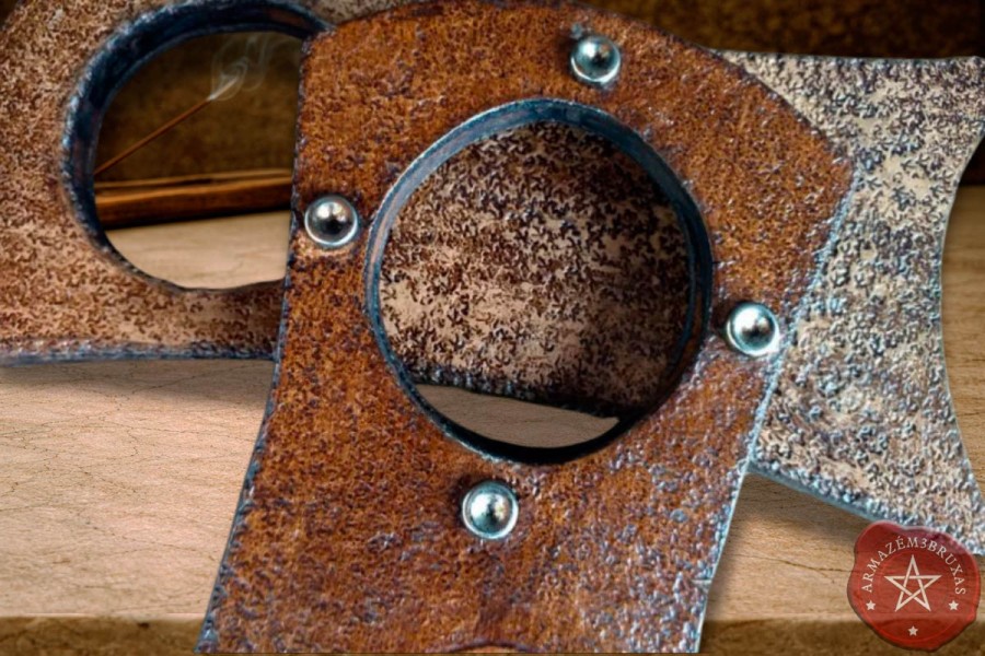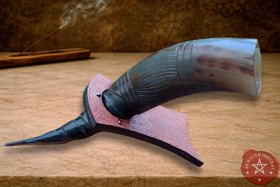 Expositor artesanal em madeira, revestido frente e verso com couro bovino rígido, levemente escurecido com o propósito de evocar a rusticidade sagrada dos templos antigos. Peça hábil para sustentar Drinking Horns médios ou grandes em altares cerimoniais, mesas de festivais ou espaços de honra pessoal.
