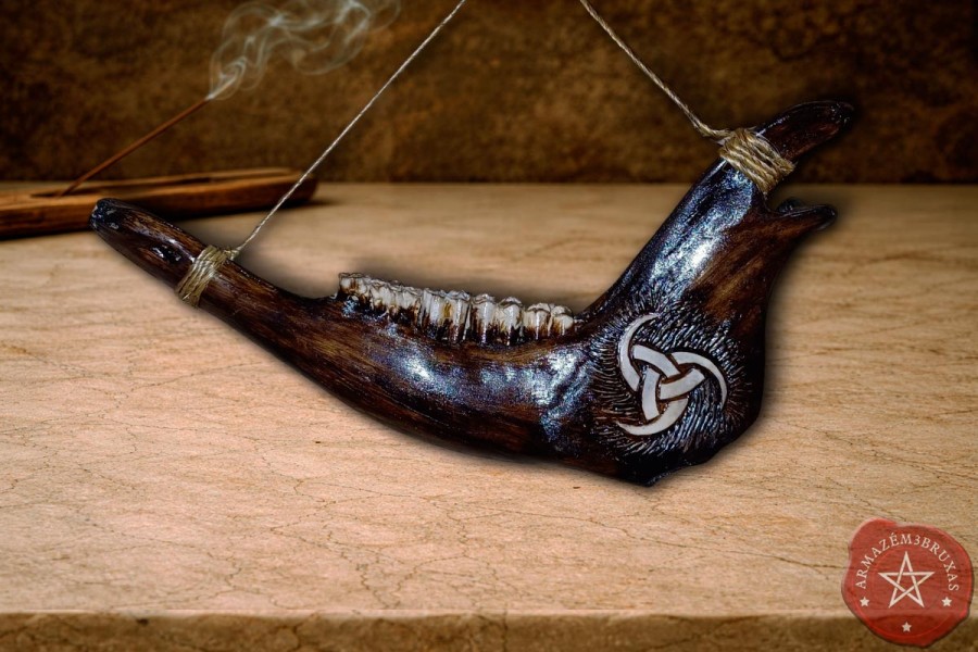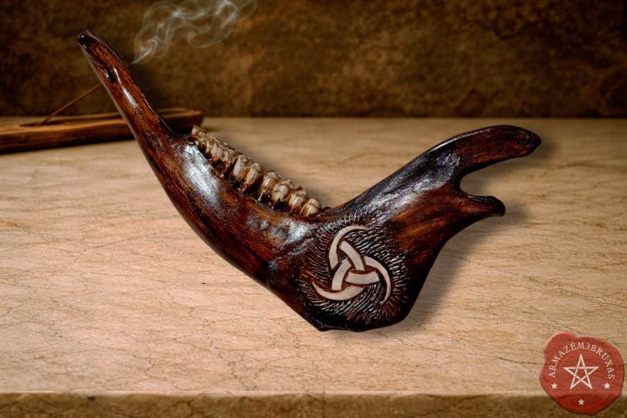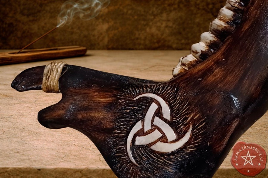 Potencializada pelo efeito natural do tempo, esta peça reserva a preservação de sua originalidade à simbologia nórdica Triple Horn, talhada em relevo, revelando a autenticidade e poder do instrumento: sabedoria, sacrifício, transformação e aliança com o sagrado masculino representado ao Deus Odin.