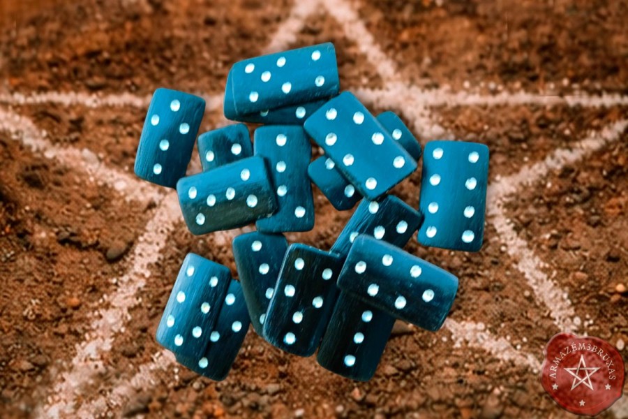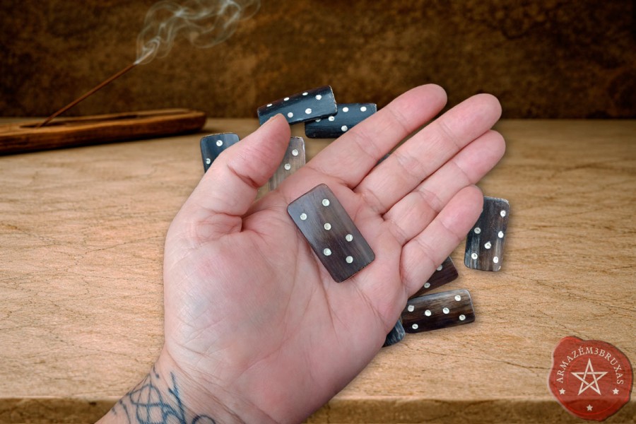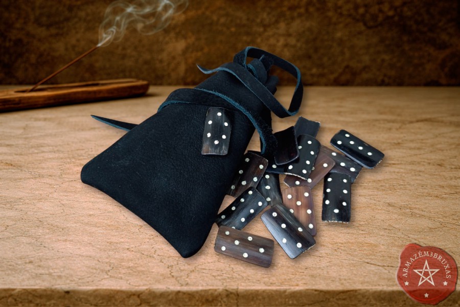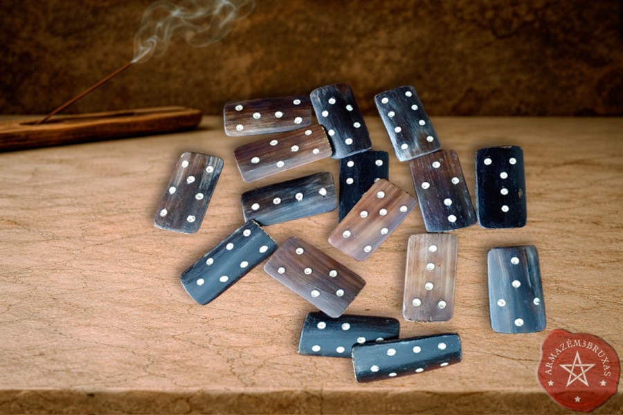 Oráculo Geomântico, com os Elementos forjados em relevo baixo por entalhe em 16 pastilhas de chifre bovino, com originalidade da matéria-prima preservadas. Suas marcações são distintas, possibilitando uma leitura precisa, intuitiva e simbólica.