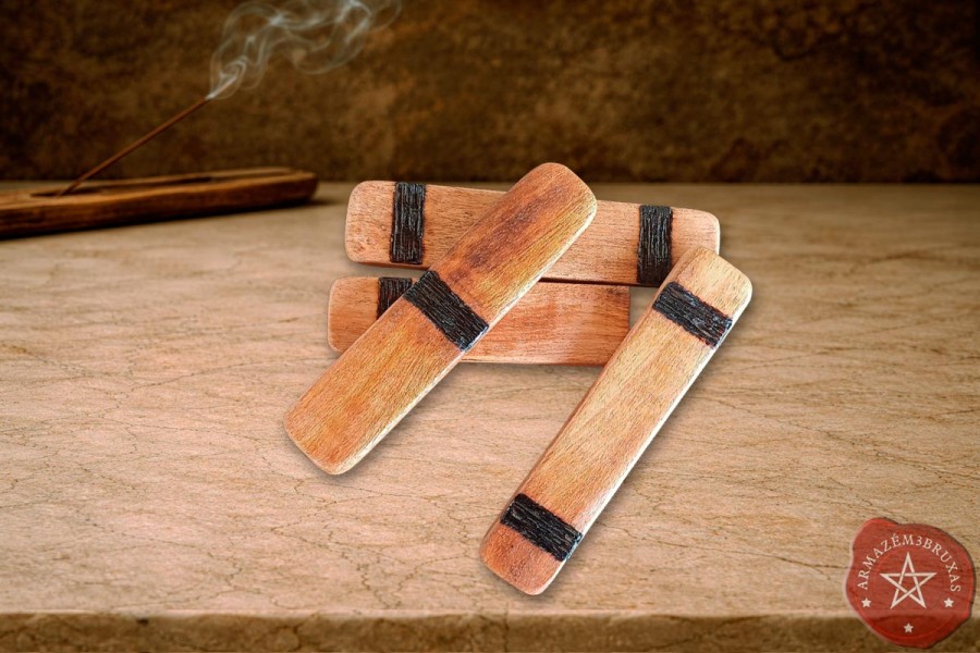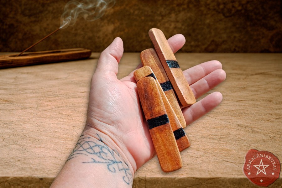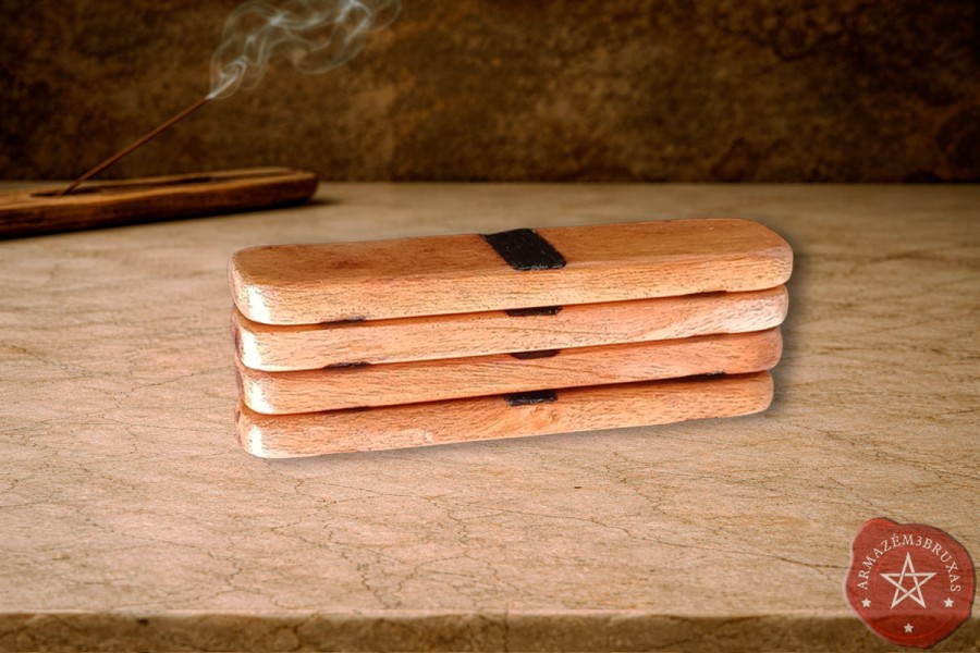 Conjunto artesanal de quatro bastões, com os Elemento forjados em relevo baixo por pirografia (queima controlada).