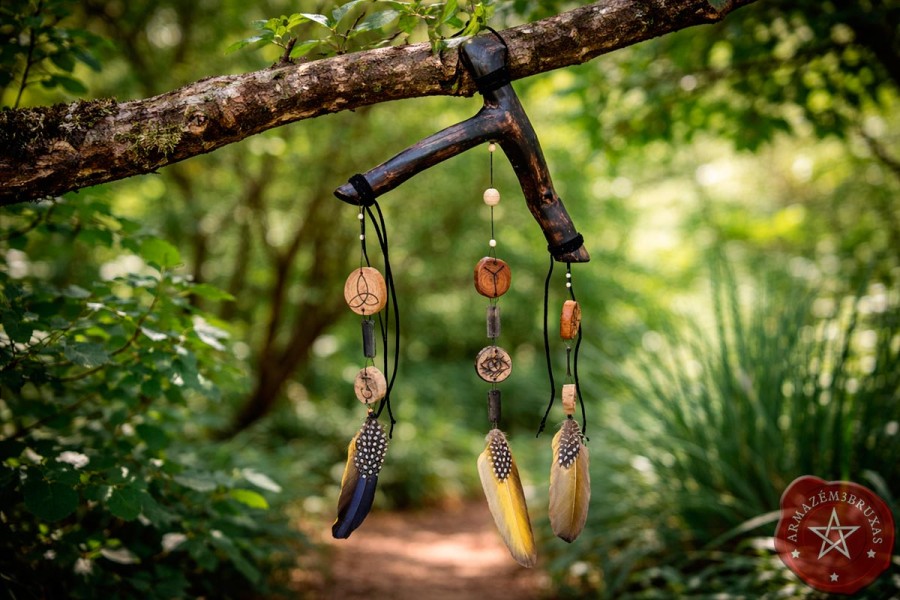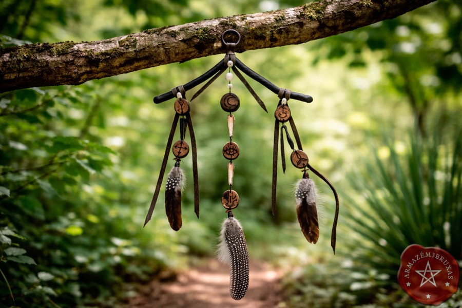 Talismã de proteção formado pelo oráculo da bruxa, com os 13 pictogramas forjados frente e verso em peças circulares de madeira, assentadas em galho natural, potencializado com elementos orgânicos: osso, couro, pena, lasca de chifre bovino e coco - símbolos diretos de Mãe Terra e seus ciclos eternos.