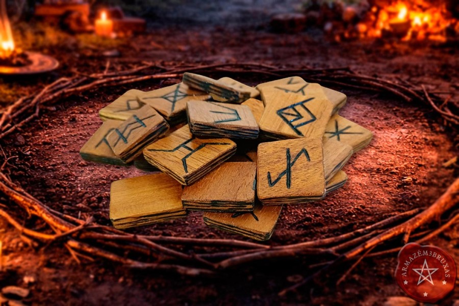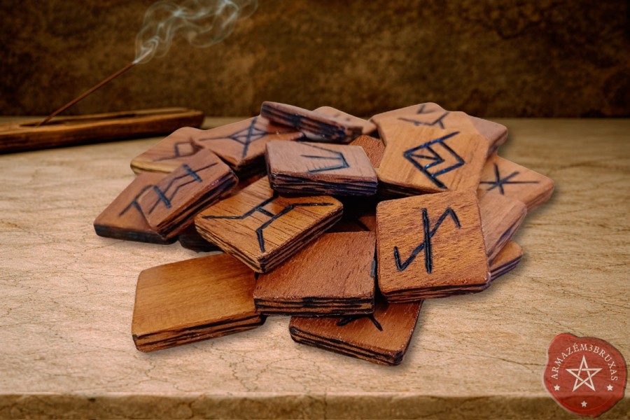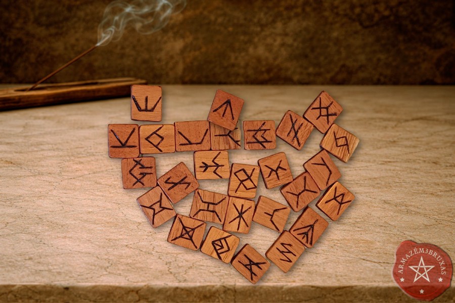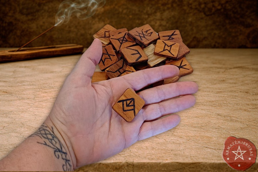 Conjunto exclusivo de 27 runas draconianas, forjada em pastilhas de madeira por pirografia (queima controlada), com tonalidade preservada.