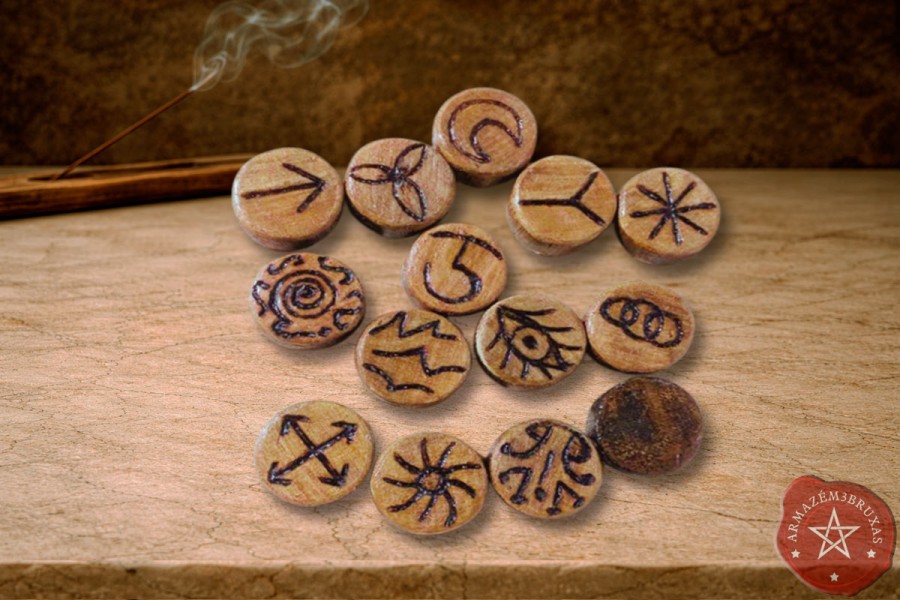 Oráculo da Bruxas formado por um galho torneado de Cedro, com tonalidade preservada. As marcações dos 13 pictogramas são talhadas em baixo relevo e recebem acabamento em pirografia (queima controlada).