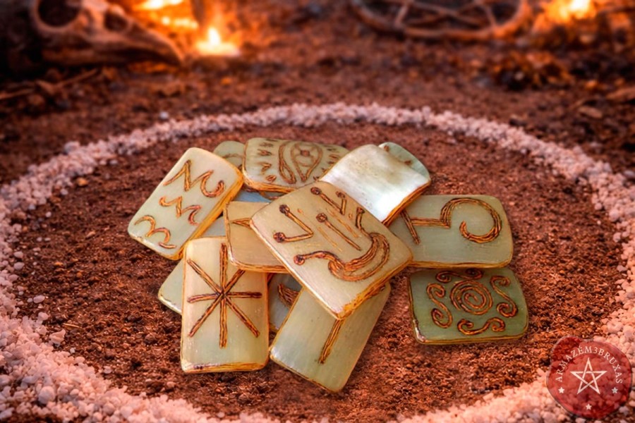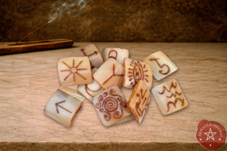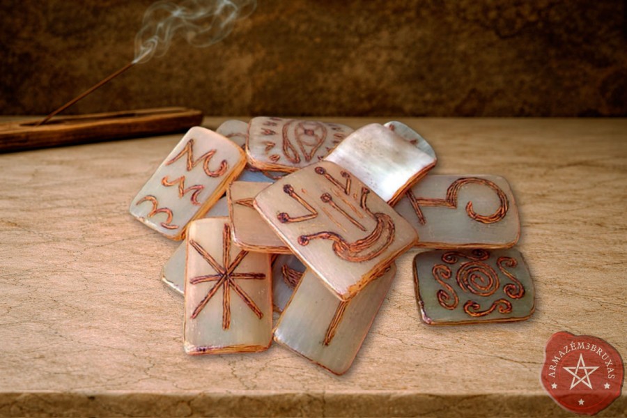 Oráculo da Bruxas, com 13 pictogramas forjados por pirografia (queima controlada) em pastilhas de chifre bovino, com originalidade da matéria-prima preservada.