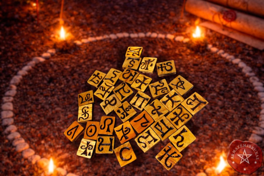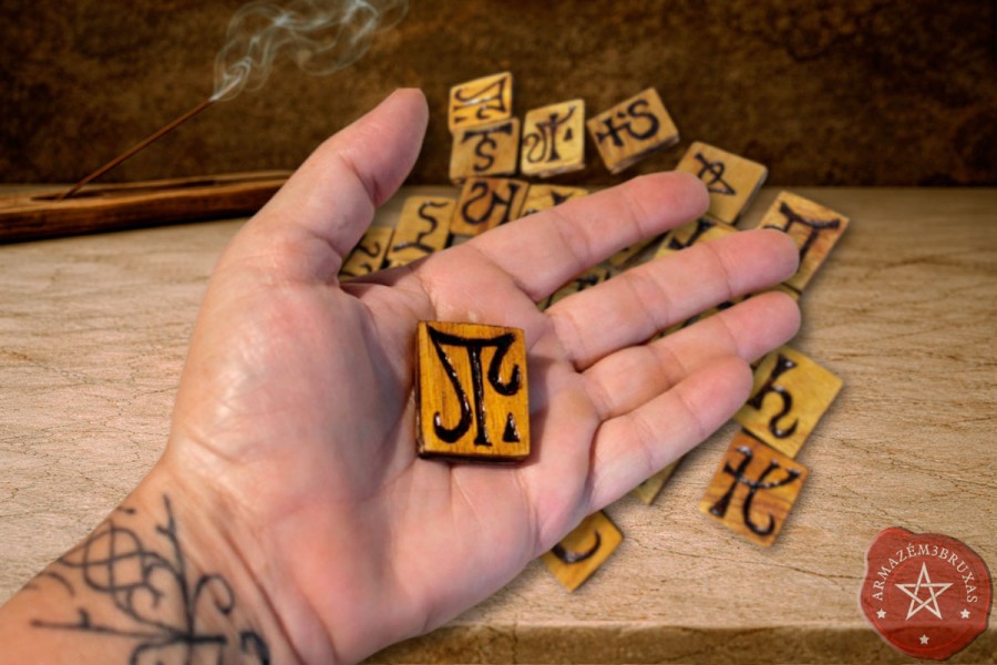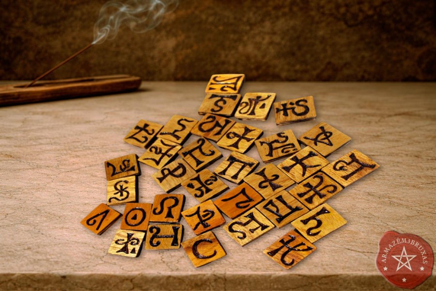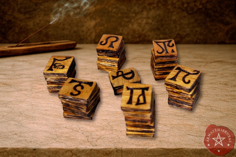 Oráculo exclusivo Élfico, com 34 pictogramas gravados por pirografia (queima controlada) em pastilhas de madeira com tonalidade preservada.