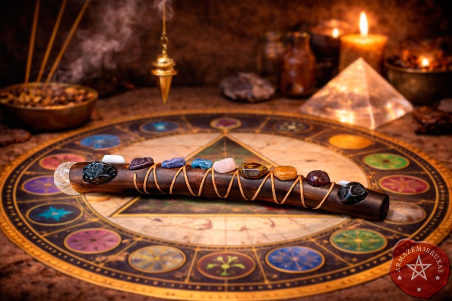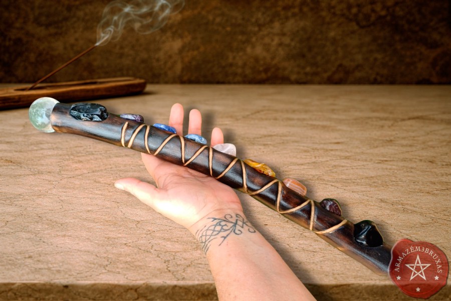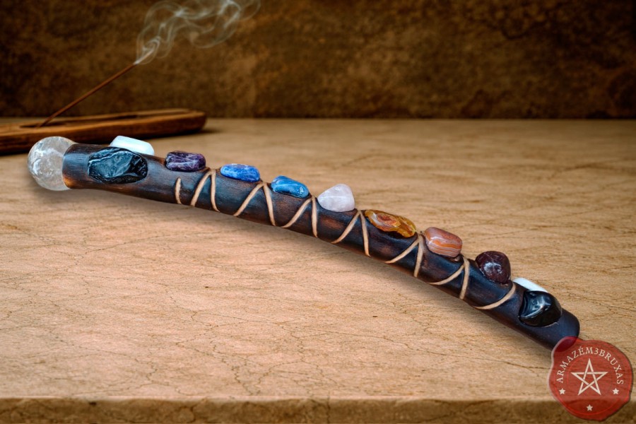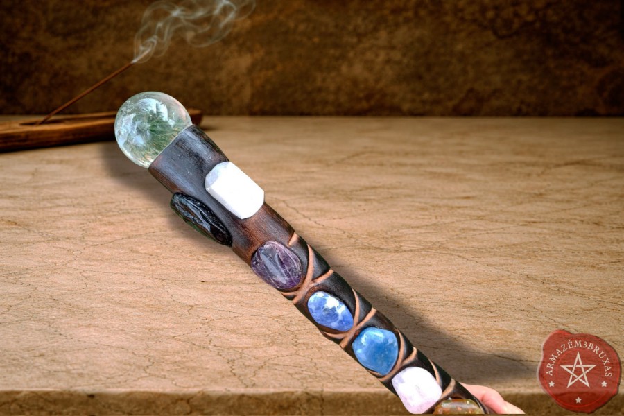 Bastão Magnético forjado em galho natural de madeira carbonizada, potencializado com cristais representando os 7 Chakras principais assentados harmoniosamente sobre os entalhes alinhados em sincronia com o fluxo Kundalini, conectando-os com a energia vital canalizada até a esfera cristalina posicionada no topo do bastão, irradiando o magneto da cura ao momento vibrado.