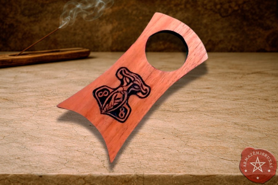 No centro da peça, Odin, o Viajante dos Nove Mundos, o Deus do Conhecimento, das Runas e da Morte Iniciática é talhado em relevo com acabamento em pirogravura. Face principal apresenta tonalidade levemente escurecida, já o verso recebe escurecimento mais profundo por carbonização.