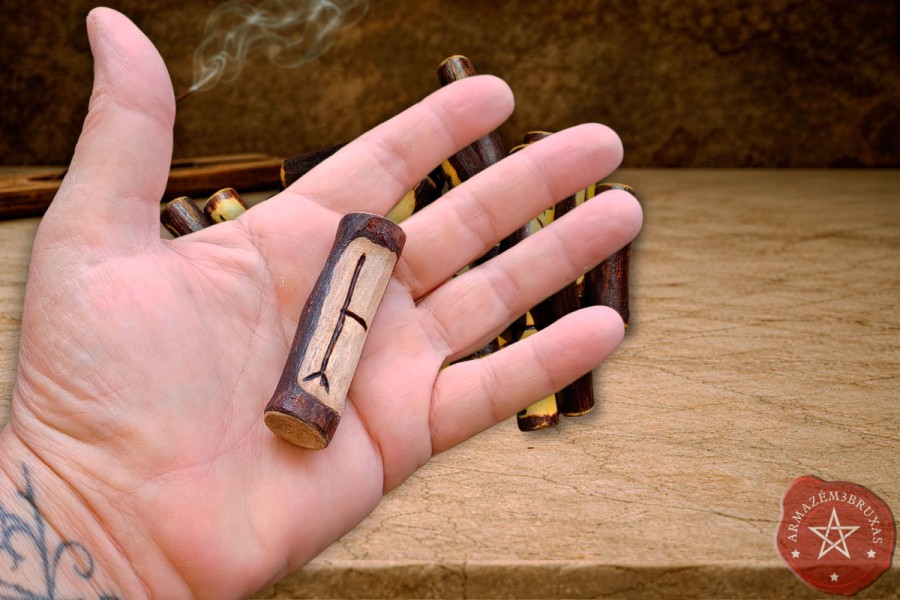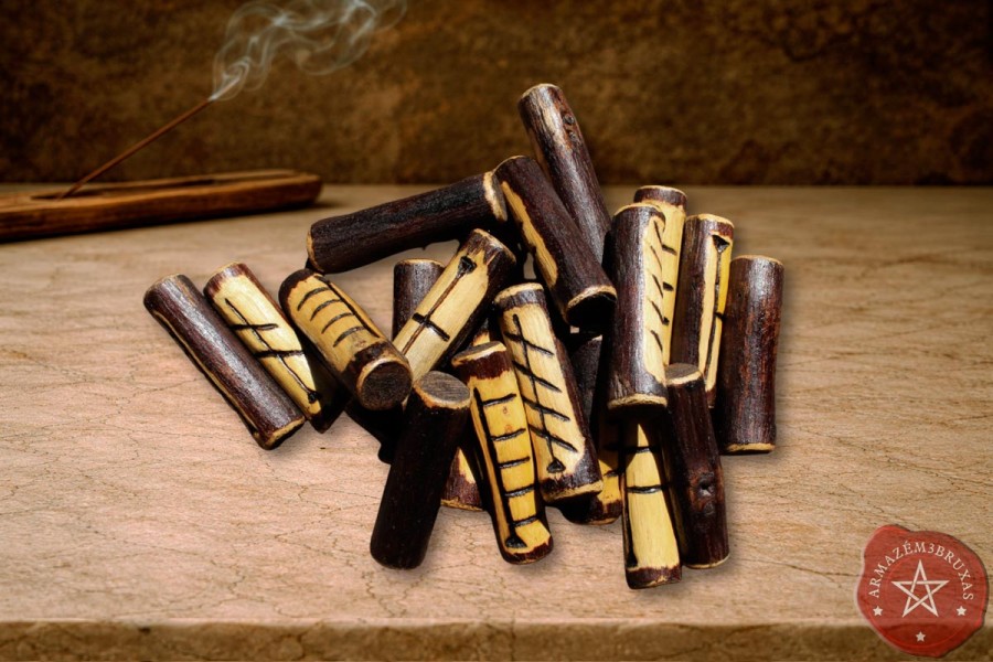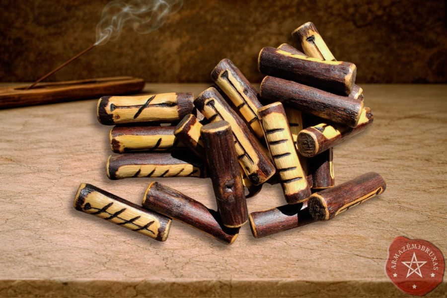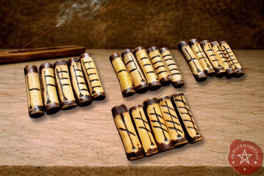 Oráculo Ogham composto por 20 caracteres originais, forjados em um único galho de madeira, respeitando sua curvatura natural e tonalidade preservada.