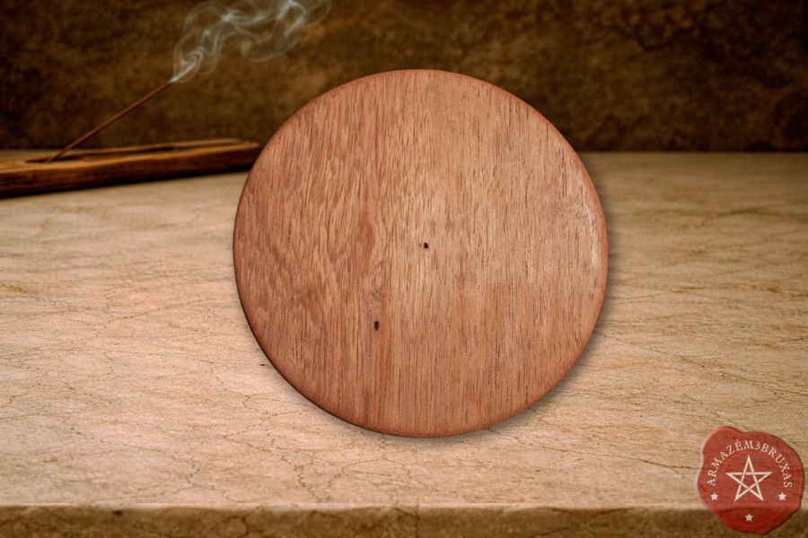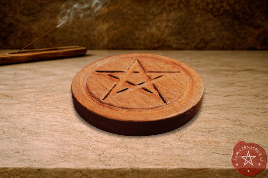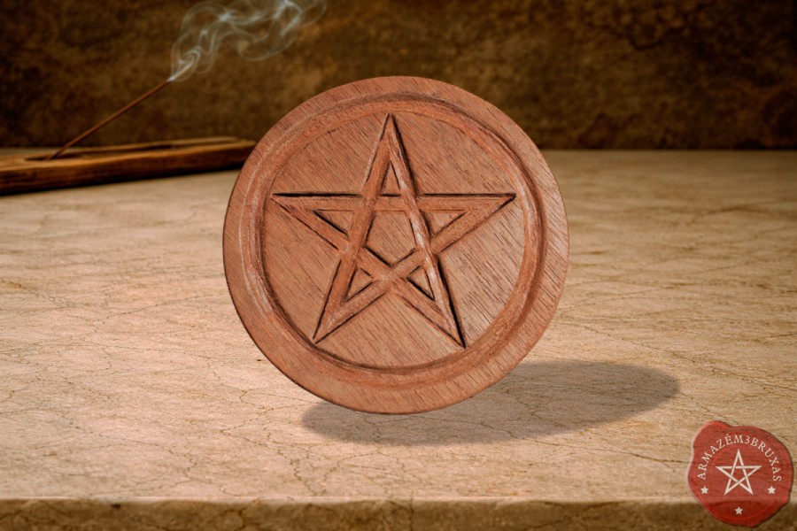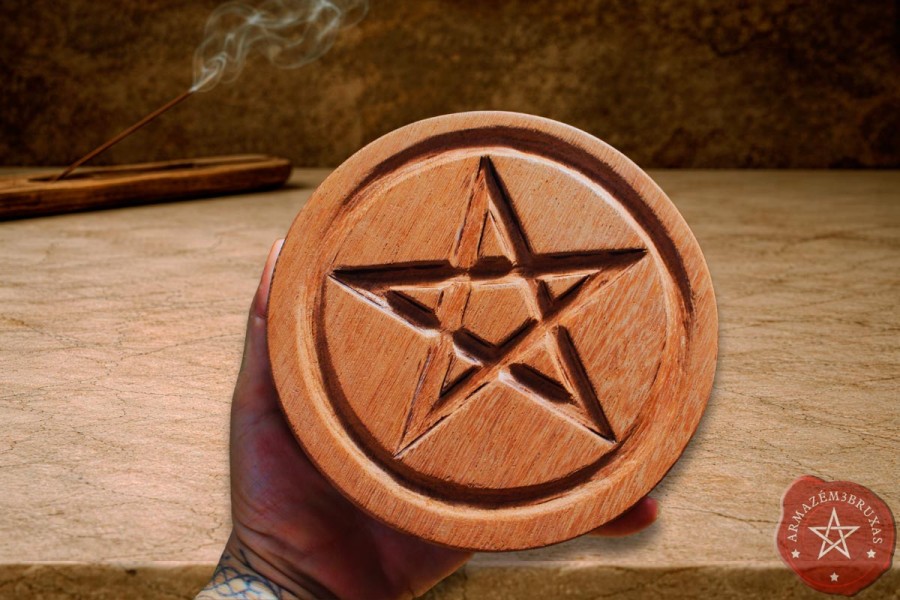 Pentáculo Pentagrama, forjado em madeira maciça, com entalhe em baixo relevo e tonalidade preservada revelando a essência da proteção, união e o ciclo da vida.