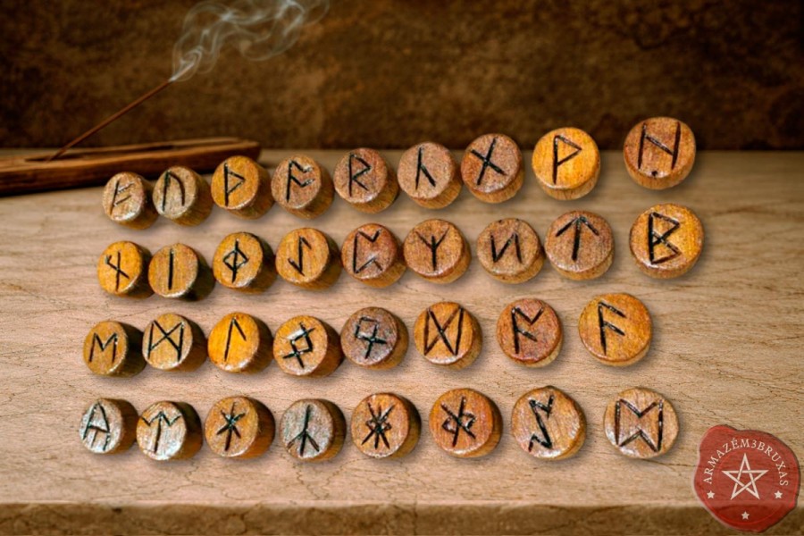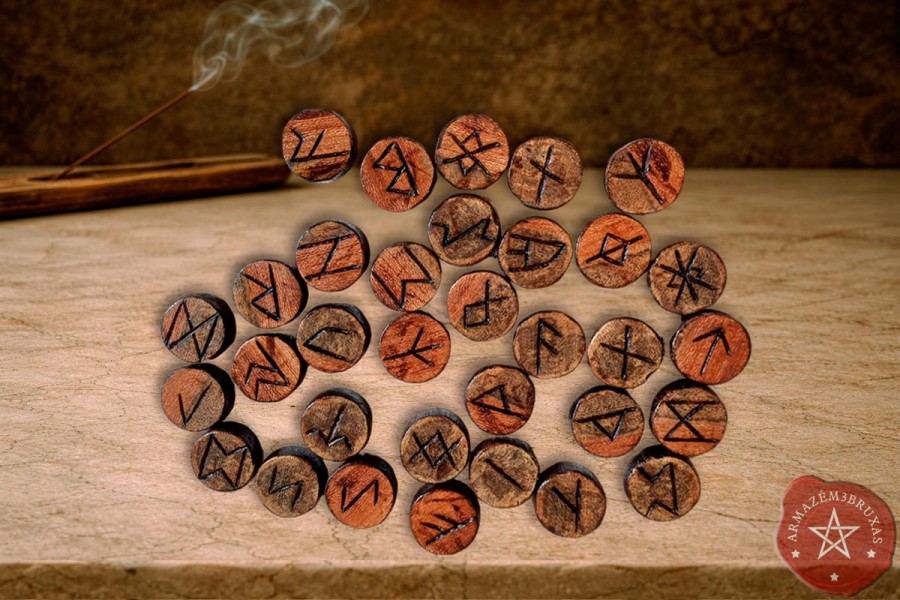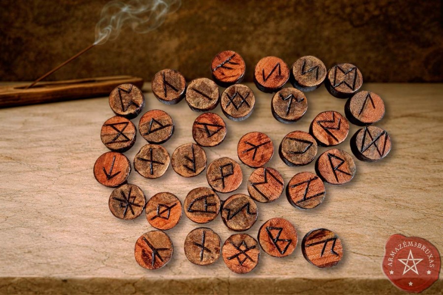 Conjunto completo das Runas Anglo-Saxônicas, também conhecidas como Futhorc, composto por 34 caracteres forjados em galho natural torneado, com tonalidade na área da leitura preservada. As gravações são apresentadas em baixo relevo, com acabamento em pirogravura (queima controlada).