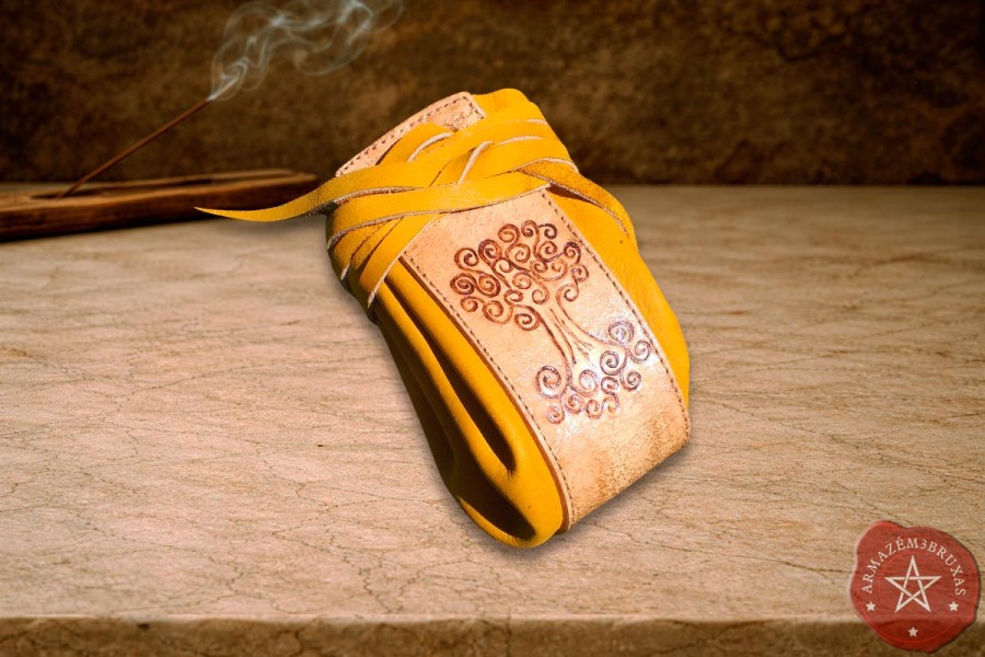 Em sua área central externa, um painel de couro bovino rígido acolhe, em pirogravura, a simbologia ancestral da Árvore da Vida - imagem universal da sabedoria, do ciclo eterno e da consciência cósmica. Gravada com fogo sagrado, essa árvore carrega a memória do que foi, do que é e do que está por se tornar.- Dimensão (LxCxA): 7.0 x 14 x 5.0cm/altura.
