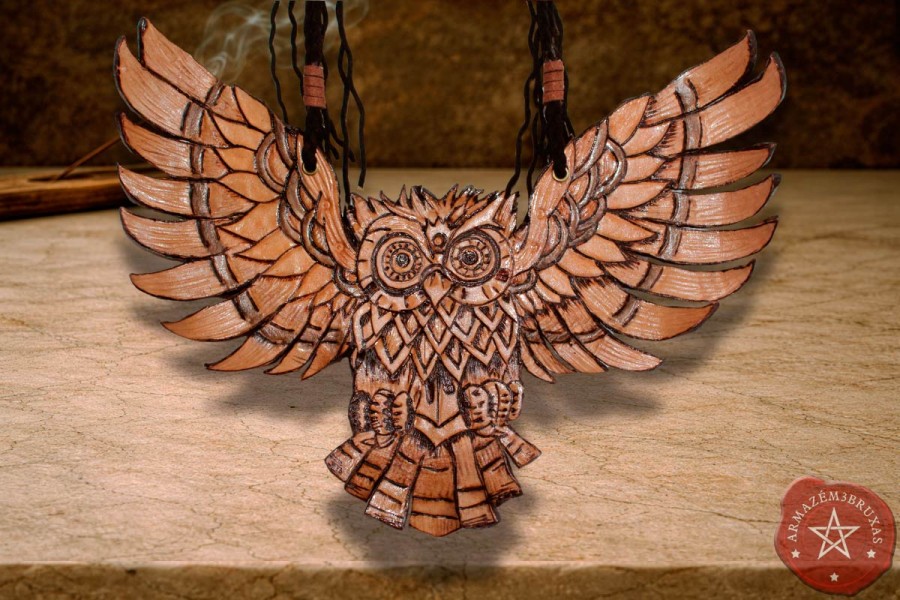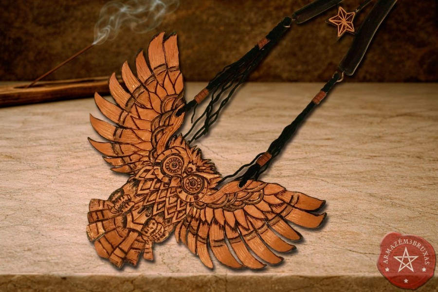 Talismã de proteção modelado em couro bovino hidratado, apresentando em relevo a Sabedoria Ancestral (Coruja), com acabamento através de pirogravura (queima controlada).
