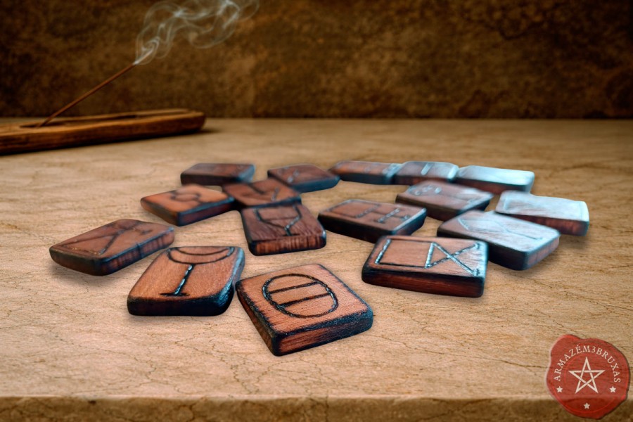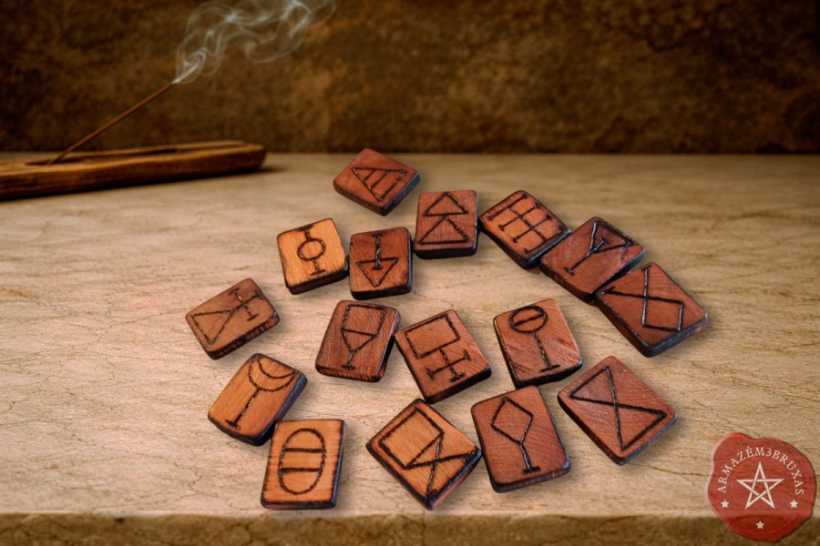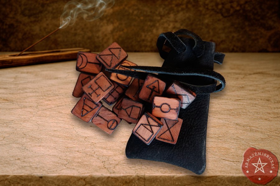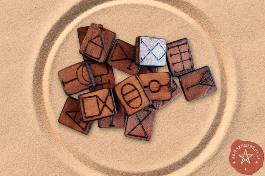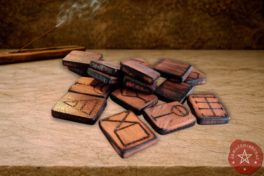 Conjunto de 16 sigilos geomânticos forjados por pirografia (queima controlada) em madeira no formato pastilha, com acabamento carbonizado. Área de leitura a tonalidade original da madeira é preservada, possibilitando uma leitura precisa e intuitiva.