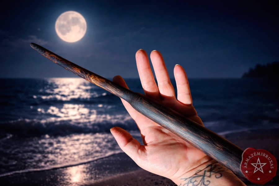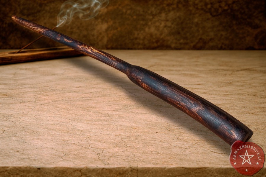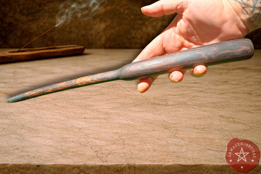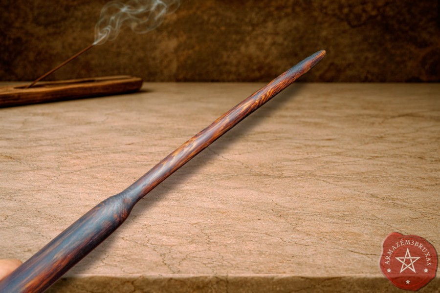 Varinha de magia, forjada em galho natural carbonizado. Apresenta um layout clássico e ancestral, respeitando sua curvatura original.