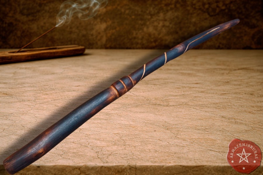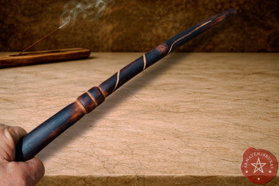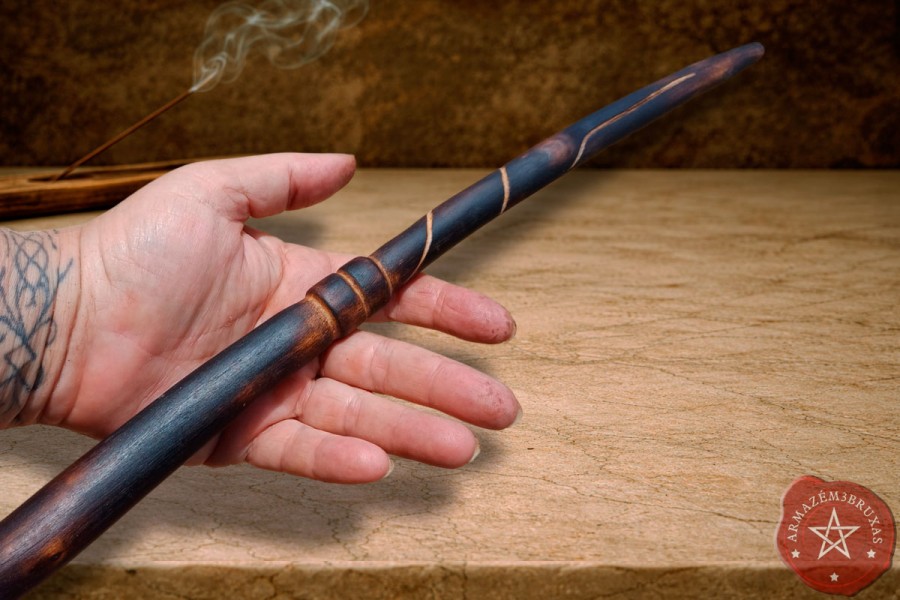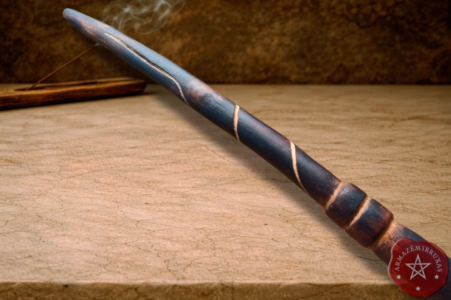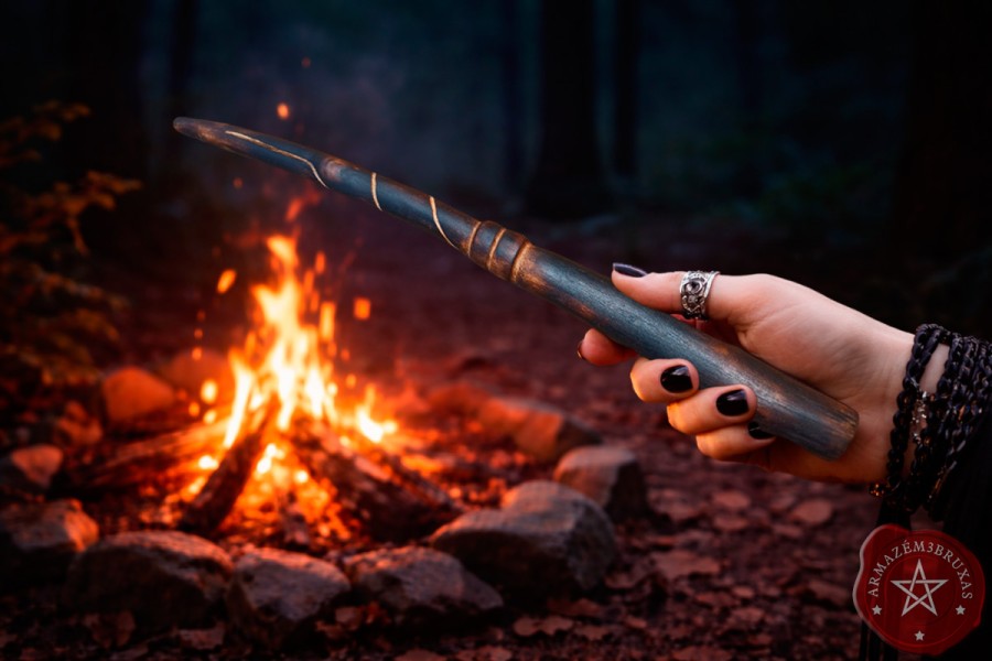 Varinha de magia, forjada em galho de Figueira Branca carbonizado (queima controlada), com punho entalhado e haste personalizada com entalhe espiral em relevo baixo, mantendo a curvatura original preservada.