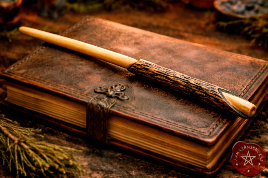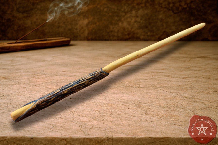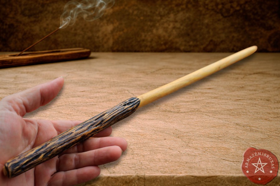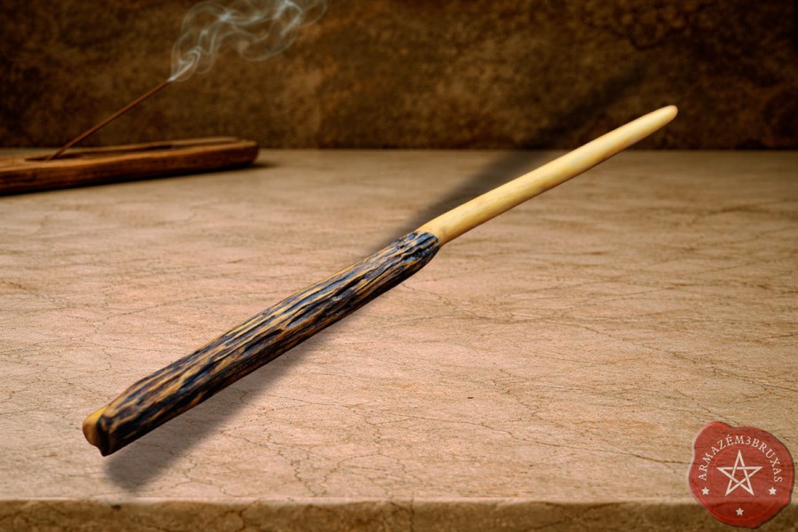Varinha de magia exclusiva, modelada artesanalmente em galho de Primavera. Seu punho é entalhado, com tonalidade escurecida por carbonização, evocando os mistérios do fogo sutil que transmuta. A haste torneada com a curvatura natural preservada, mantém a vibração original do galho.