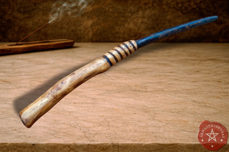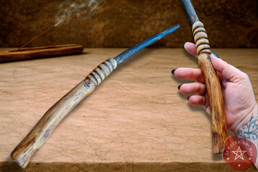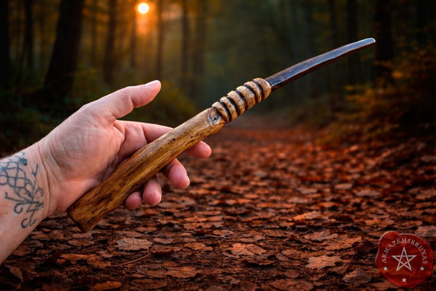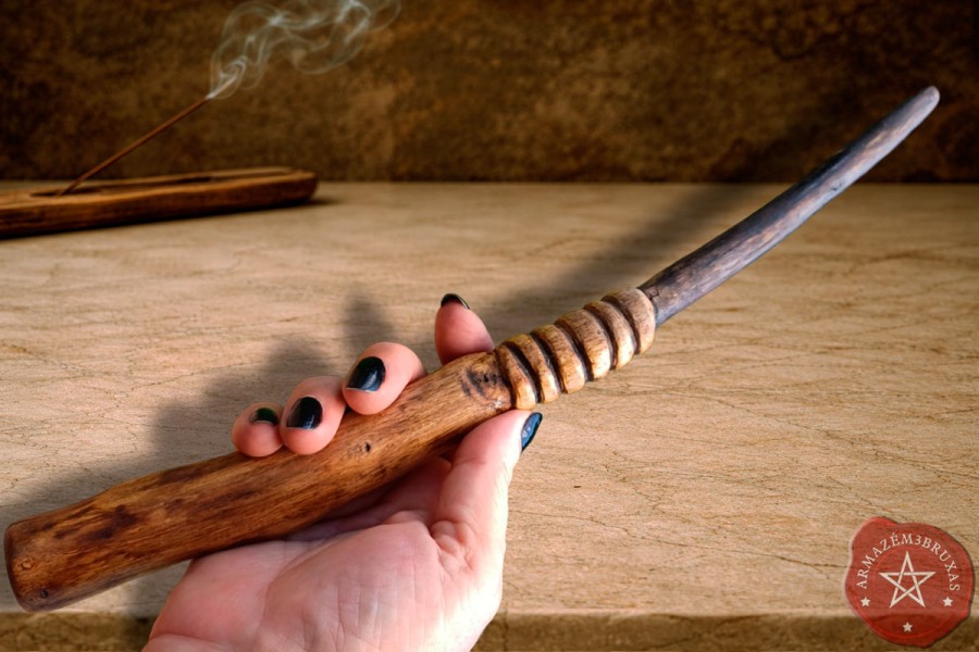 Varinha de magia exclusiva, modelada em galho de Amoreira, com punho entalhado e haste torneada. Curvatura original do galho preservada e tonalidade da haste escurecida por carbonização.
