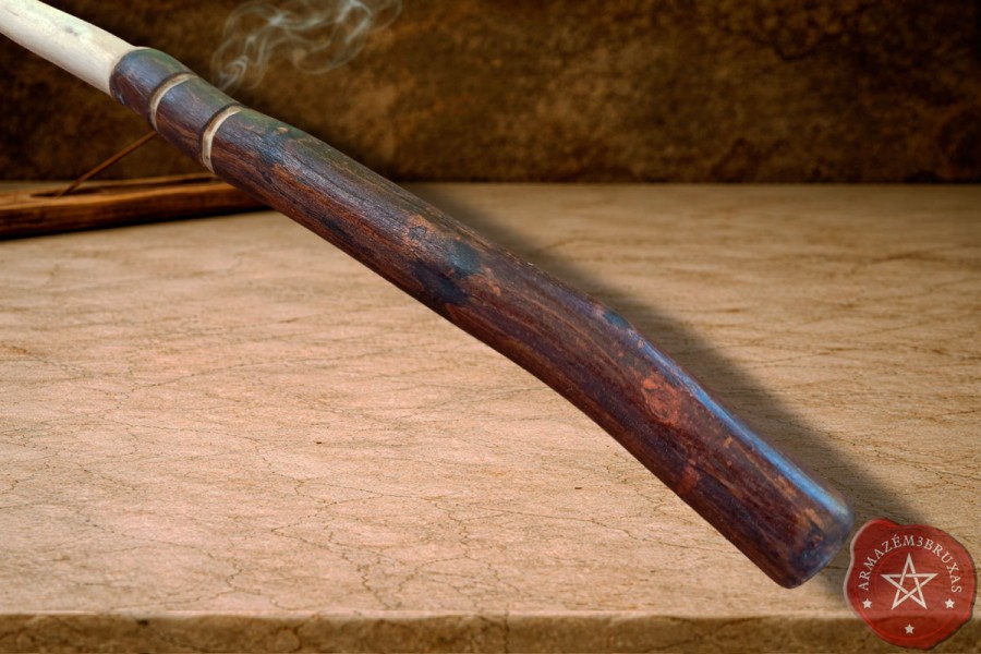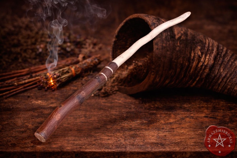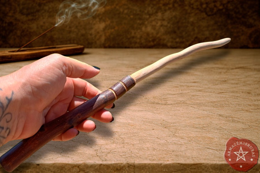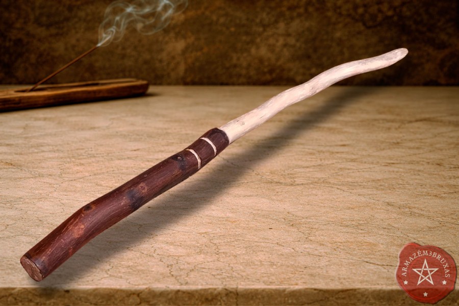 Varinha de magia exclusiva, modelada artesanalmente em galho de Amoreira, com curvatura original preservada, honrando o traço sagrado moldado pela Natureza. Seu punho foi mantido a casca natural da madeira, personalizado com entalhe, guardando a memória do tempo. A haste torneada preserva a tonalidade clara e original da Amoreira, revelando uma peça de leveza, precisão e sabedoria vibracional.