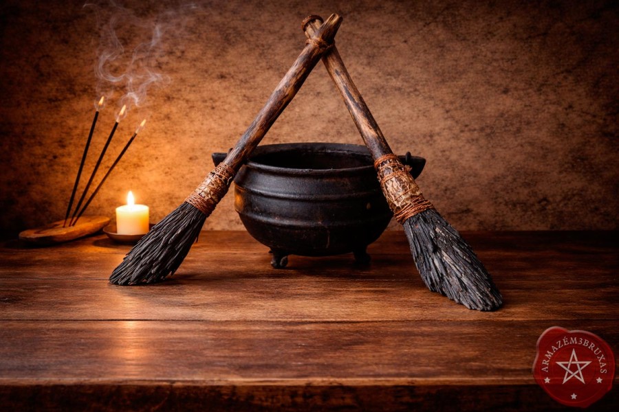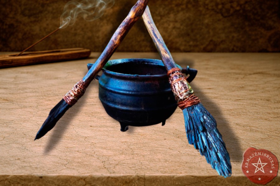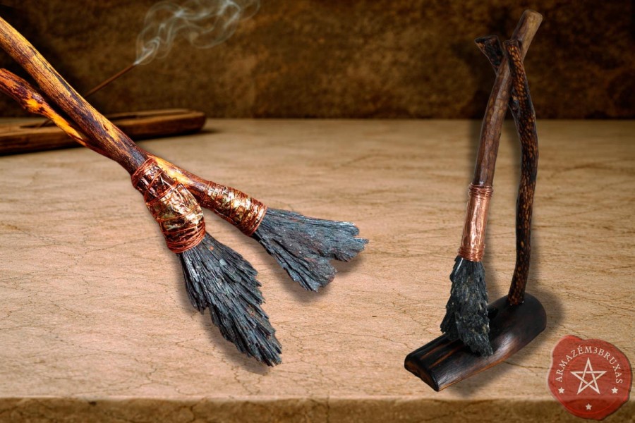 Vassoura da Bruxa, composta por pedra Cianita Preta bruta, assentada ao punho de galho natural, revestido com cobre genuíno, potencializando a condução energética do instrumento.